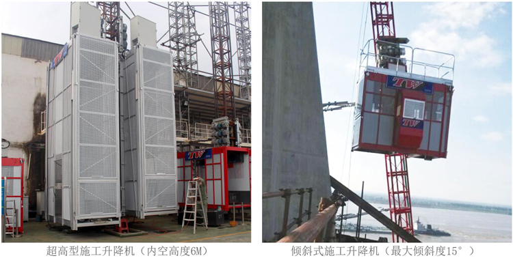 SC系列特殊机型 SC800G双柱施工升降机: 1.采用双导轨结构,升降机采用变频控制,运行平稳 2.特制限速装置,实现一个限速器两端同步制停 3.超大型吊笼,用于运体积大、重量重货物