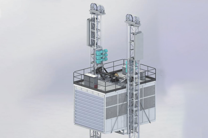 SC800G双柱施工升降机: 1.采用双导轨结构,升降机采用变频控制,运行平稳 2.特制限速装置,实现一个限速器两端同步制停 3.超大型吊笼,用于运体积大、重量重货物