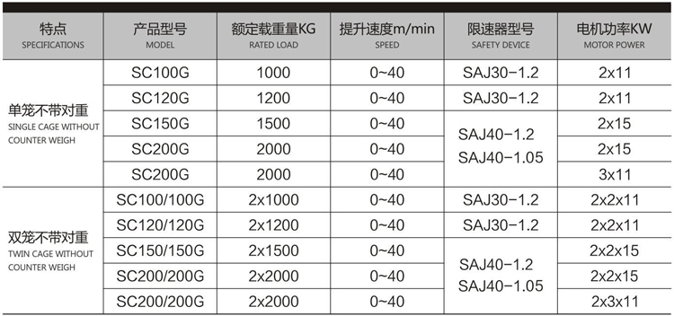 SC系列工频变频双控制升降机| 额定速度:0-40米/分钟 SC系列工频变频施工升降机是普通梯的升级版,不仅拥有普通梯的优点另外它还具有如下优点: 1.能实现工频变频转换。 2.速度可调,操作更方便。 3.启制动平稳,制动过程无冲击,运行平稳,乘坐更舒适。 4.制动平稳,降低机械磨损,使机械使用寿命延长。 5.可以根据面板跟踪电梯运行情况,实时监控。